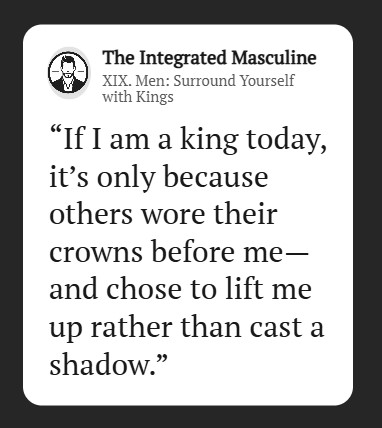 I’m certainly not saying that the men taking their own lives didn’t have good male support, or didn’t have men in their lives who could’ve changed the decision that was made, but the proof is in the pudding—surrounding oneself with men who align with the king archetype can have profound benefits for mental health and overall well being.